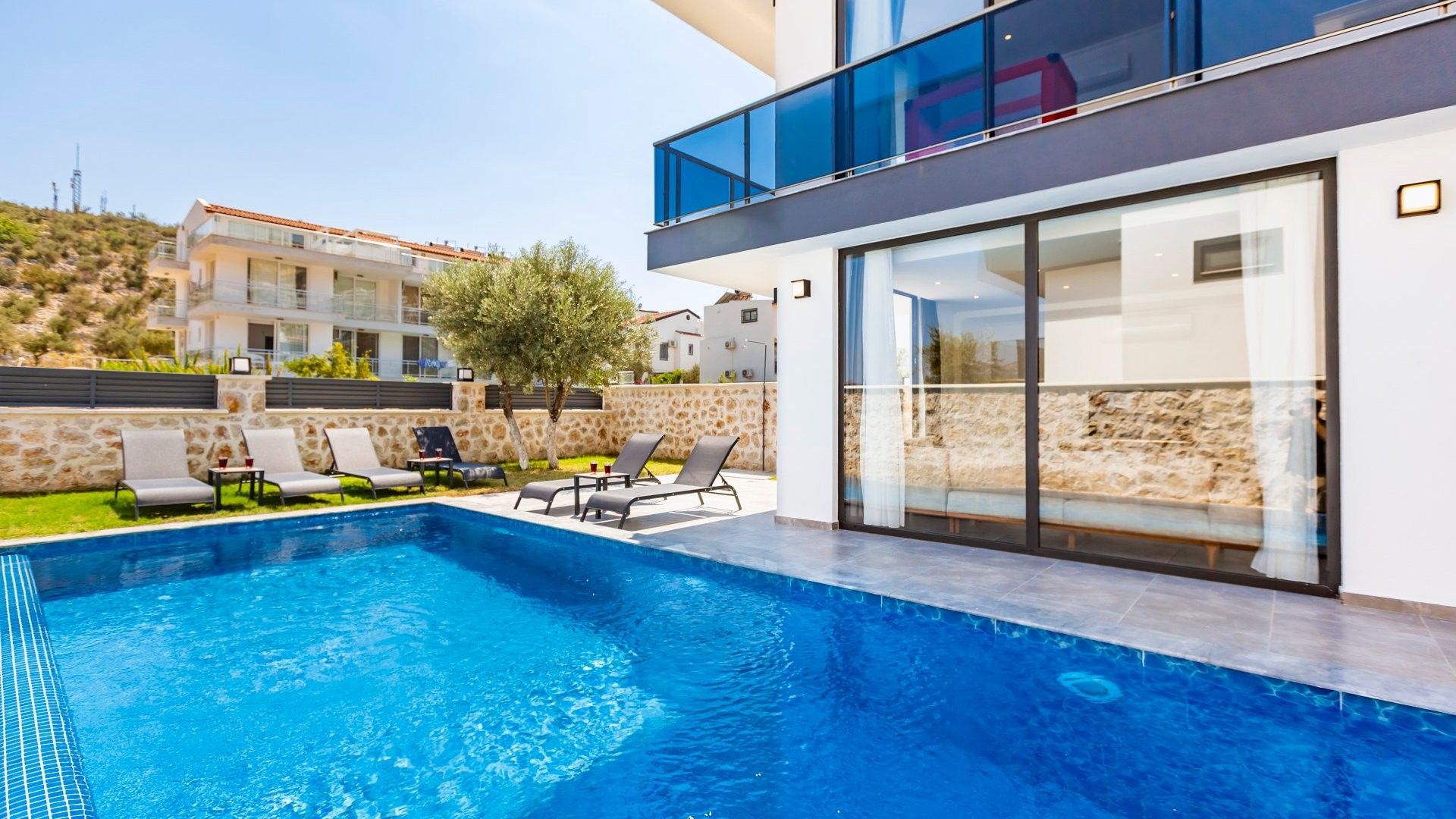 Villa Lipsos 2, Kalkan Kalamar Bölgesi'nde bulunan yatak odasında 2 kişilik jakuzi ve korunaklı yüzme havuzuna sahip, 3 yatak odası ile 6 kişilik konaklamaya imkan sağlayan, küç...